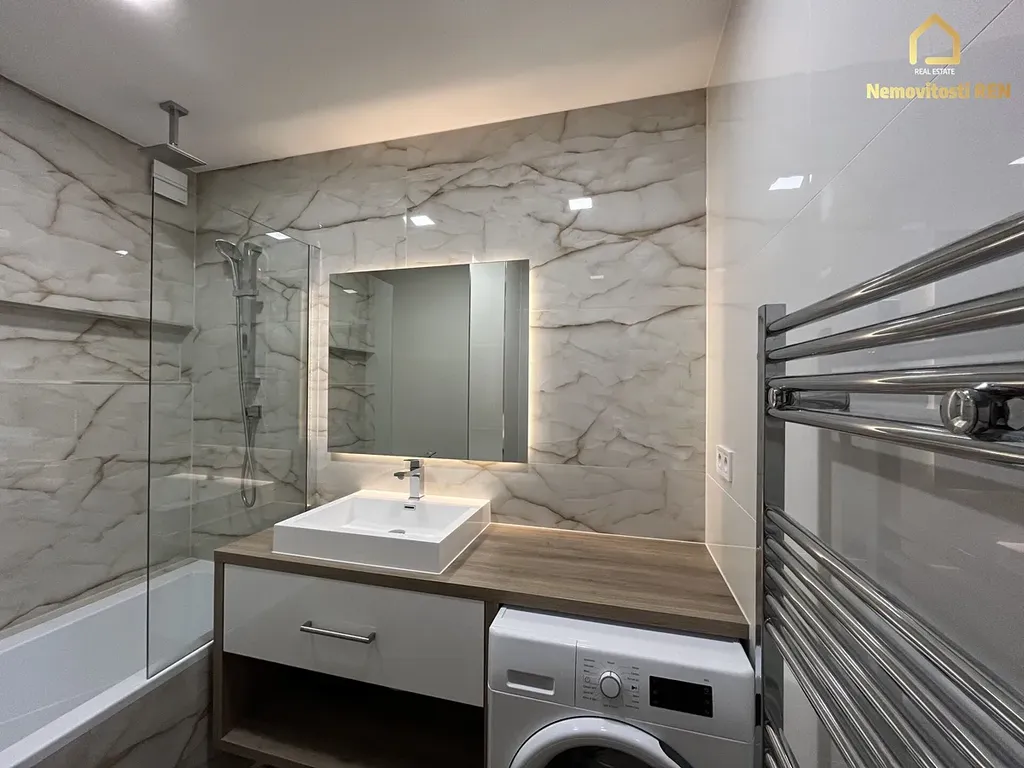 Prostorná koupelna je vybavena vanou, umyvadlem, zrcadlem a nachází se zde prostor pro pračku. Velkou výhodou je samostatná šatna, která nabízí praktický úložný prostor.