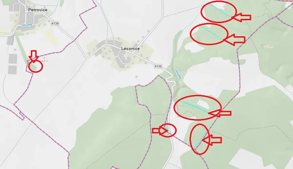 - p.č. 1280/6 vedená jako lesní pozemek o celkové výměře 485 m2, z toho vlastníme podíl 2/3 tedy 323 m2 (stáří lesa 41 let - zastoupení dřevin dub),