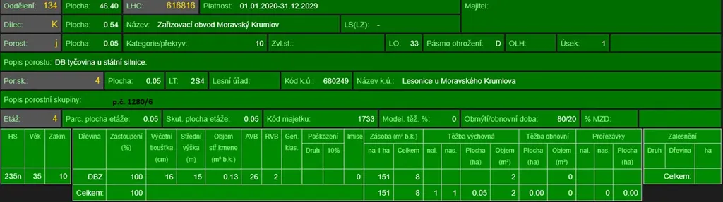 - p.č. 1134/12 vedená jako lesní pozemek o celkové výměře 3 810 m2, z toho vlastníme podíl 2/3 tedy 2 540 m2 (stáří lesa 104 let - zastoupení dřevin dub, akát, stáří lesa 78 let - zastoupení dřevin akát, stáří lesa 10 let - zastoupení dřevin dub, akát),