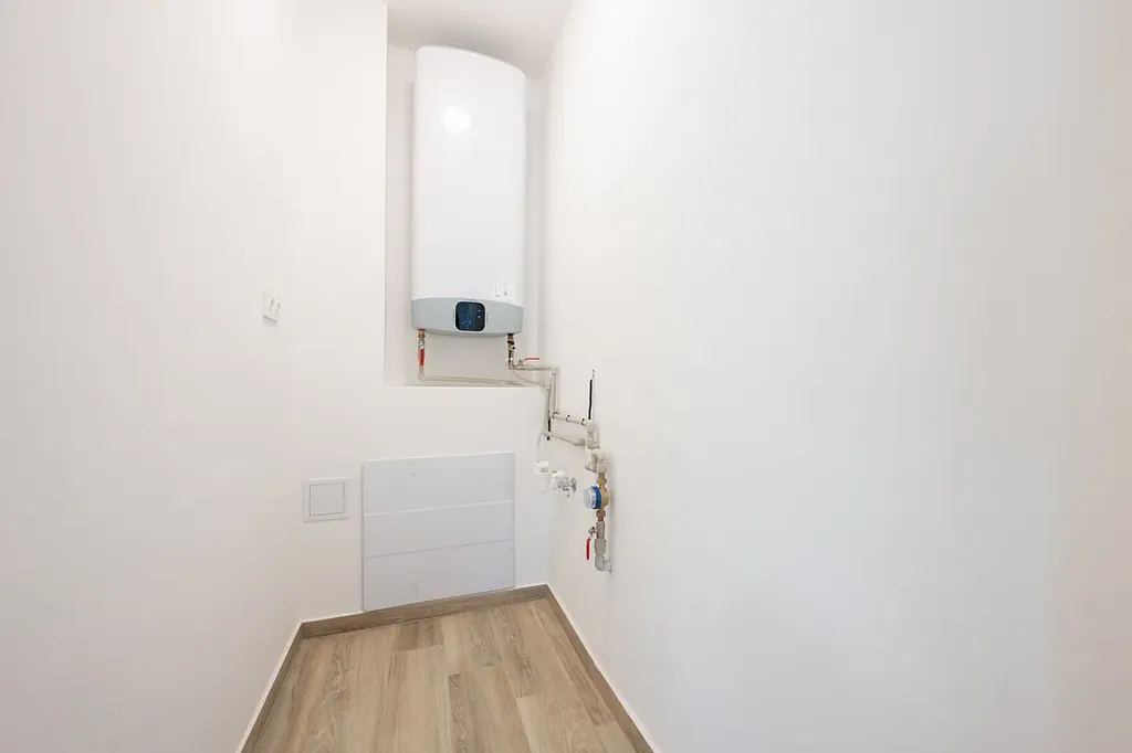 Byt má víceokruhové elektrické podlahové topení s termostaty v každé místnosti.