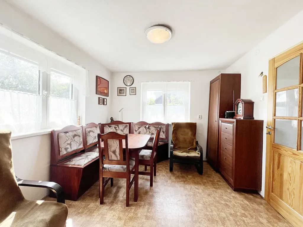 Dům má 2 nadzemní podlaží o celkové rozloze 65m², sklep, garáž, samostaný skleník a dřevník v zadní části pozemku. V přízemí se nachází předsíň, zděná veranda, obývací pokoj, malá ložnice, kuchyň s komorou, wc a vstup do sklepa. V podkroví naleznete dvě samostatné ložnice. Koupelna se nachází za garáží a vstupuje se do ní ze zahrady. V suterénu domu je sklep s menší dílnou a regály na potraviny. Garáž je přistavěna k boční straně domu a šlo by na ní postavit další patro a zvětšit tak dispozici stavby až o 20m². V zahradě jsou okrasné dřeviny a keře, skleník a za domem dřevník. Dům je zděný, je vytápěn kamny na tuhá paliva, má vlastní studnu a odpad je řešen jímkou.