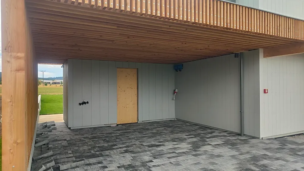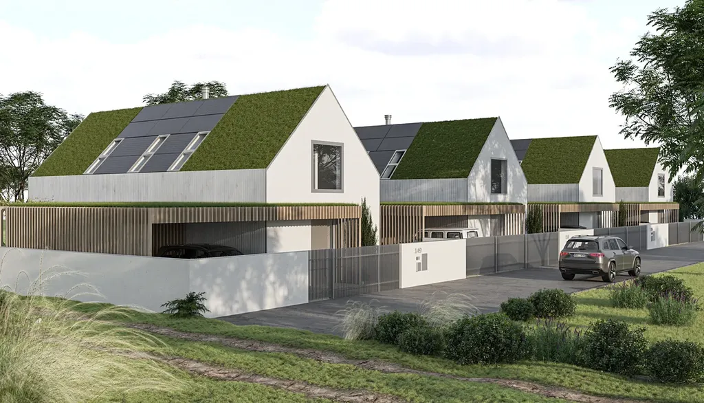 Díky velkým proskleným plochám a posuvným portálům se dům přirozeně otevírá do zahrady, která plynule přechází do okolní přírody. Dvě prostorné terasy nabízejí ideální prostor pro relaxaci, grilování nebo ranní kávu s výhledem do zeleně. Součástí pozemku je i krytý přístřešek pro dvě auta s přípravou na nabíječku pro elektromobil a s integrovanou kolnou třeba na zahradní nářadí či zimní kola od aut.