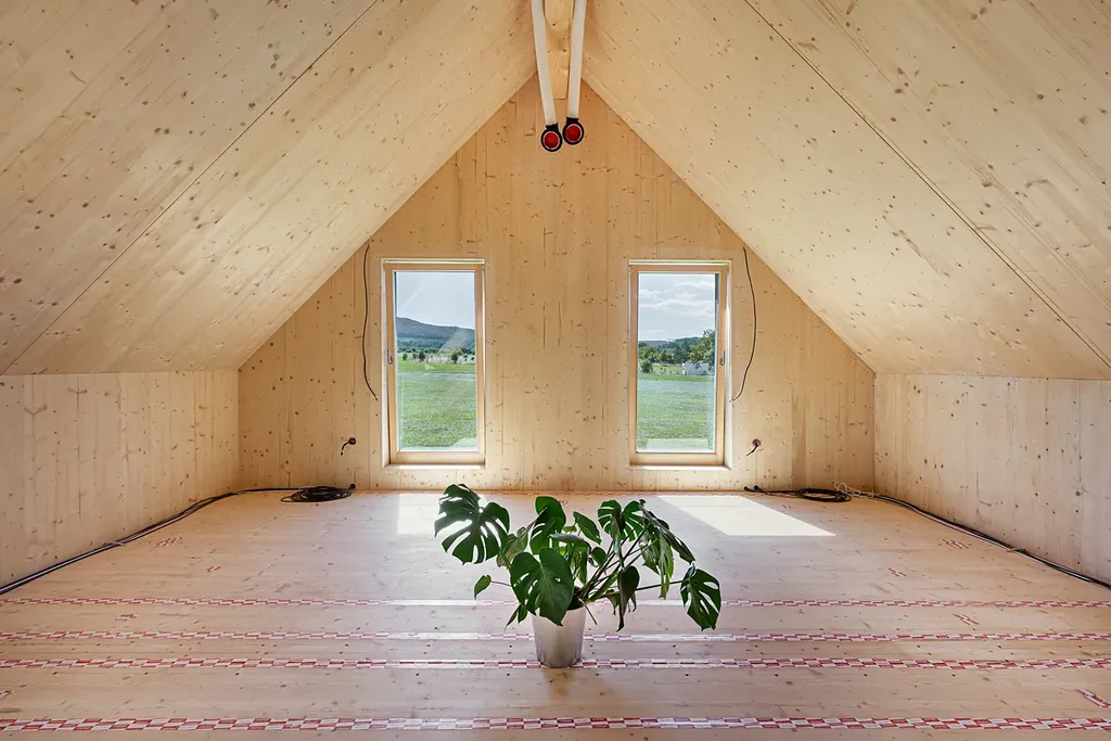 Tato dvoupodlažní dřevostavba je postavena z CLT panelů Novatop => žádné lehké duté OSB stěny, ale poctivé masivní dřevo. Fasáda a střecha jsou provětrávané, izolované přírodním dřevovláknem => žádný polystyren. Výsledkem je nízkoenergetický dům v energetické třídě A s velmi nízkými provozními náklady z udržitelných ekologických materiálů.