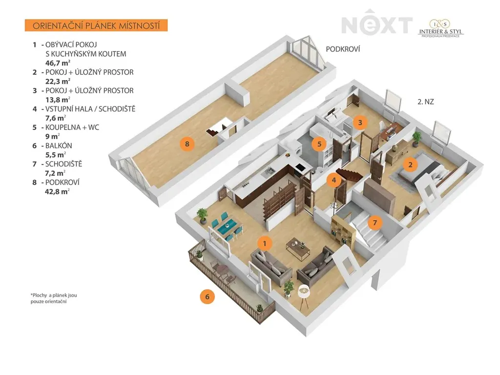 - 2. nadzemní podlaží (2. NP): byt 3+kk o vnitřní podlahové ploše 99 m² s balkonem o velikosti 7 m² a vstupem do neobývaného podkroví, které lze snadno přeměnit na další obytný prostor nebo útulné studio.
