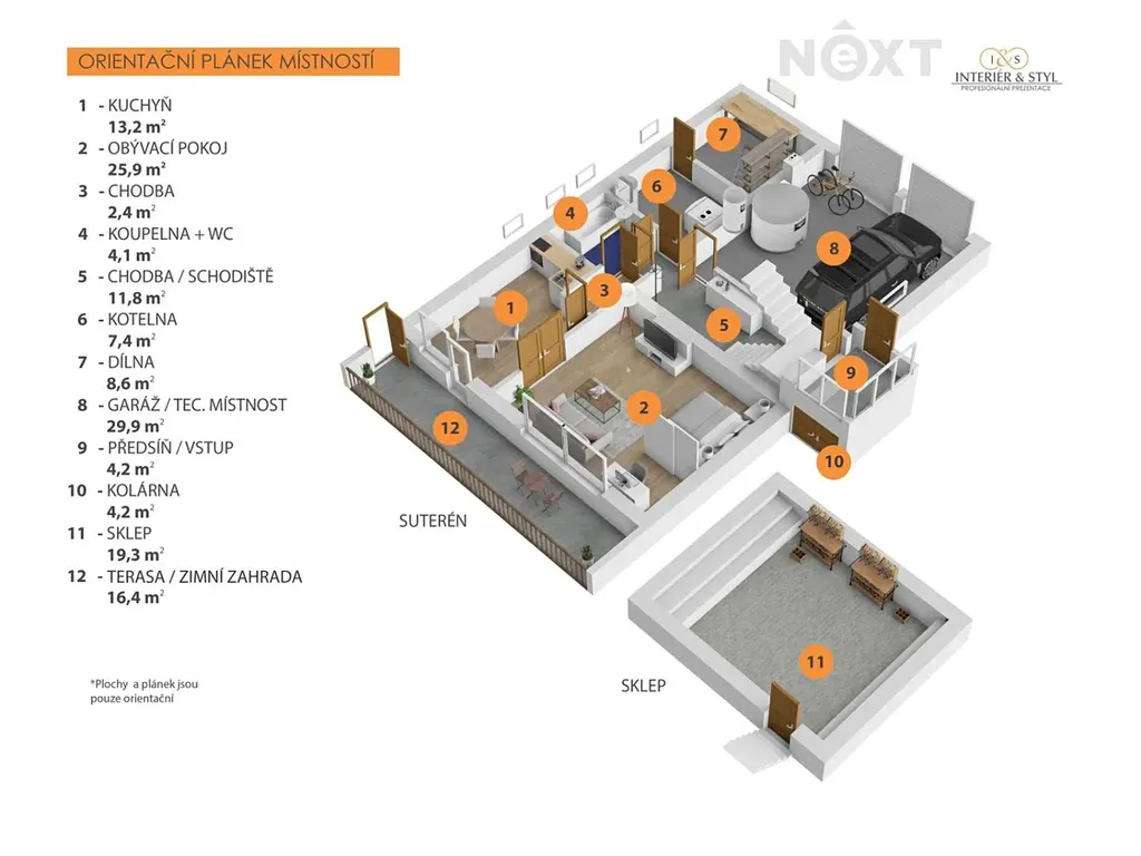 - Suterén: byt 1+1 se zimní zahradou, dále technická místnost, dílna a garáž.