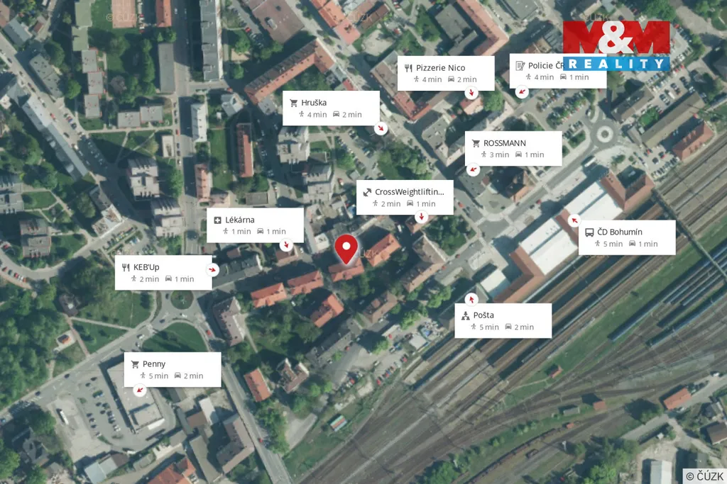 Byt je situovaný ve 3. podlaží cihlového domu bez výtahu, v centru obce Nový Bohumín, s jednoduchou dostupností veškeré občanské vybavenosti.