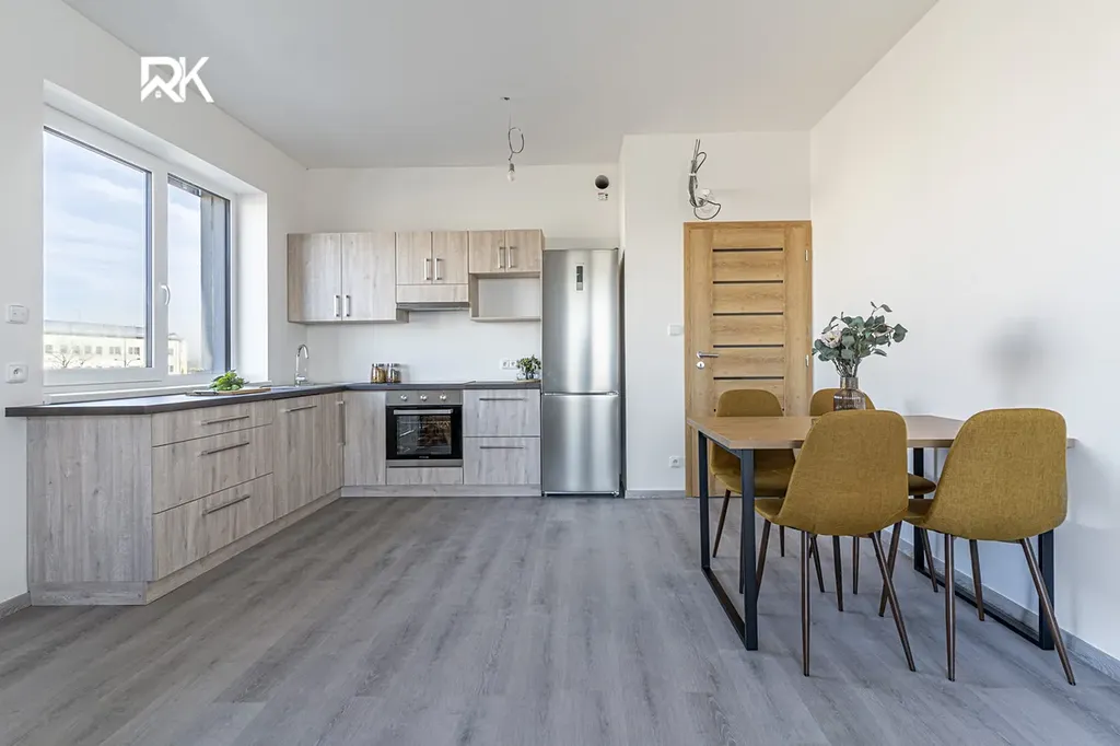 Byt je dokončen v nadstandardním provedení — kuchyňská linka a klimatizace jsou součástí ceny. Dispozice je praktická a plně funkční, ideální pro jednotlivce nebo pár.