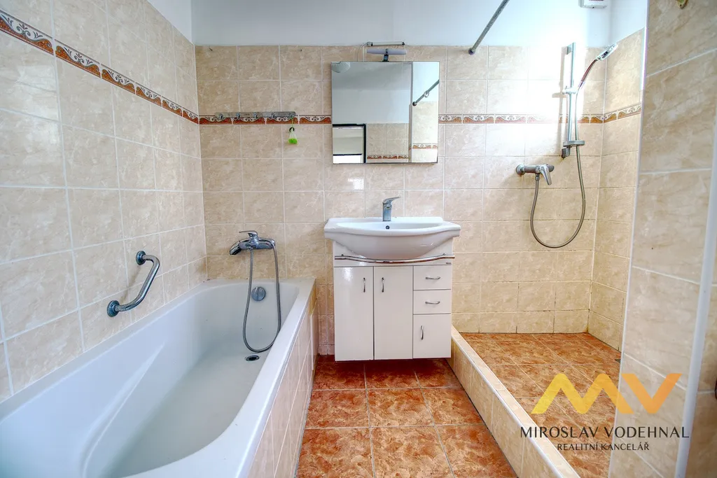 V přízemí se nachází elegantní obývací pokoj, kuchyň s jídelnou, koupelna s vanou, sprchovým koutem a toaletou, vstupní hala, veranda a terasa s příjemným výhledem do zahrady.