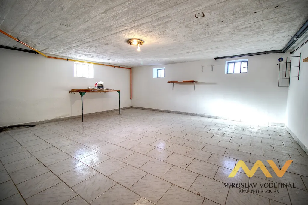 Velkorysý sklepní prostor s pěti místnostmi, garáž a půdní prostor nabízejí nadstandardní množství úložných i technických možností, včetně potenciálu pro domácí fitness, vinný sklep či hobby zázemí.