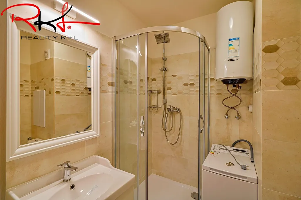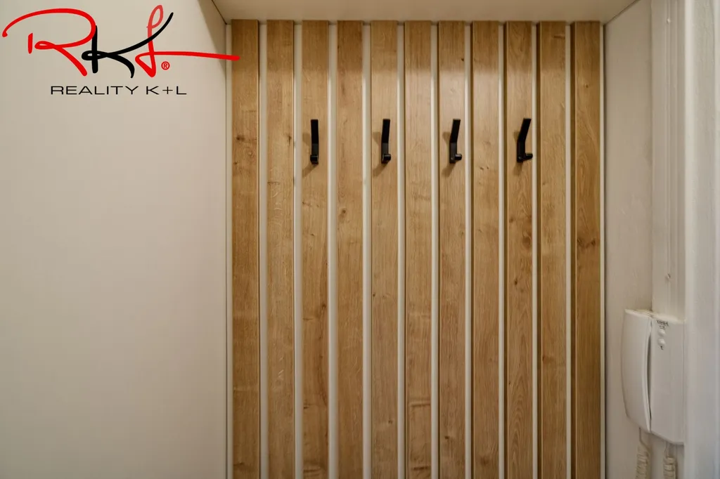 Vstupní chodba s prostornými šatními skříněmi, koupelna se sprchovým koutem, automatickou pračkou a WC, kuchyně s kuchyňskou linkou a vestavěnými spotřebiči, vstup na lodžii z kuchyně, ložnice se vstupem z kuchyně.
