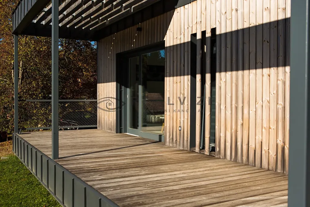 Exteriér: Upravená zahrada se zajištěnou péčí, rozdělená dřevěná terasa, venkovní kamerový systém a odkládací prostor na sportovní potřeby.