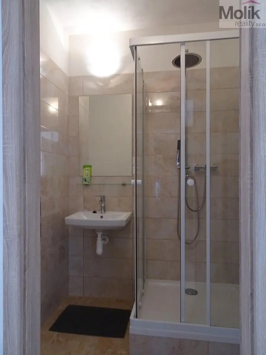 Kuchyně spojena s obývací pokojem, ložnice, koupelna se sprchovým koutem, samostatné WC, chodba.