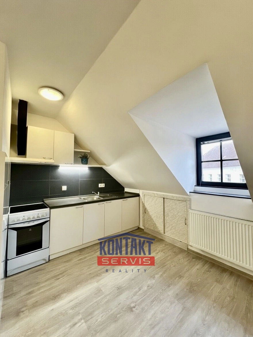 Nabízíme k pronájmu tichý a zrekonstruovaný podkrovní byt o dispozici 2+kk a výměře 45 m², který se nachází ve 2. patře historického domu v samotném centru Jindřichova Hradce.