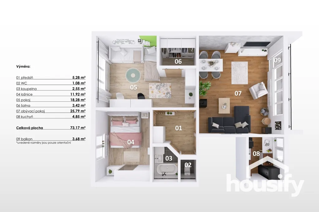 - Díky velkým oknům je celý byt prosvětlený a nabízí krásné výhledy