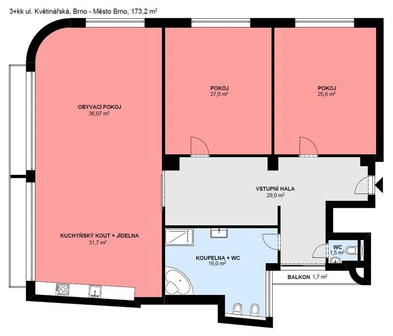 Byt (173,2 m2) se nachází v 5. patře cihlové budovy s výtahem.