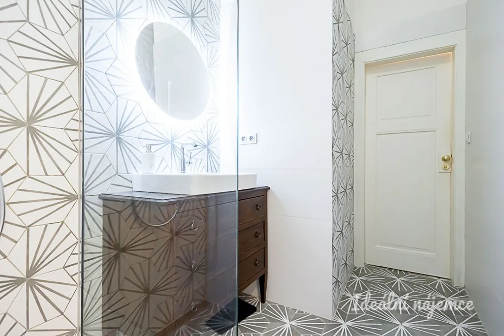 Dominantou vstupní části je centrální chodba s vestavěnou skříní, která přehledně propojuje celý byt. Nachází se zde samostatná koupelna se sprchovým koutem a stylovou restaurovanou skříňkou, oddělená toaleta a praktická komora sloužící jako technické zázemí (pračka, sušička, bojler).
