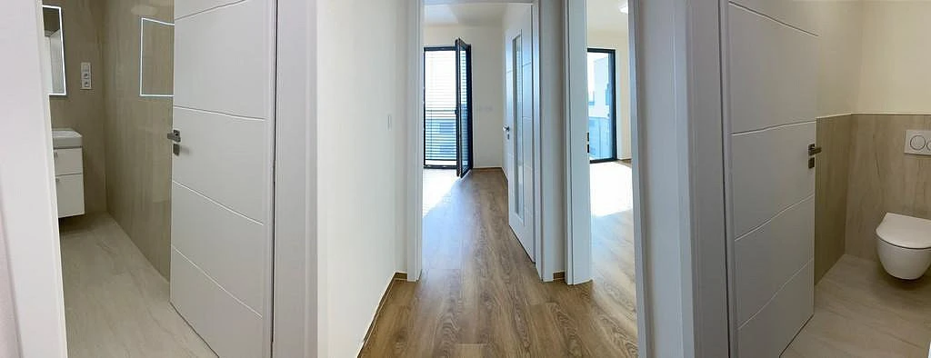 Ve druhém křídle bytu je další komora o celkové výměře cca 2,5 m² s přípravou na pračku a sušičku. Dále je tu samostatné WC o výměře cca 1,8 m². Dvě ložnice jsou velmi prostorné, každá má velké okno s výstupem na propojený balkon o výměře cca 10,6 m². Místnosti mají rozlohu cca 18,7 m² a cca 17,2 m².