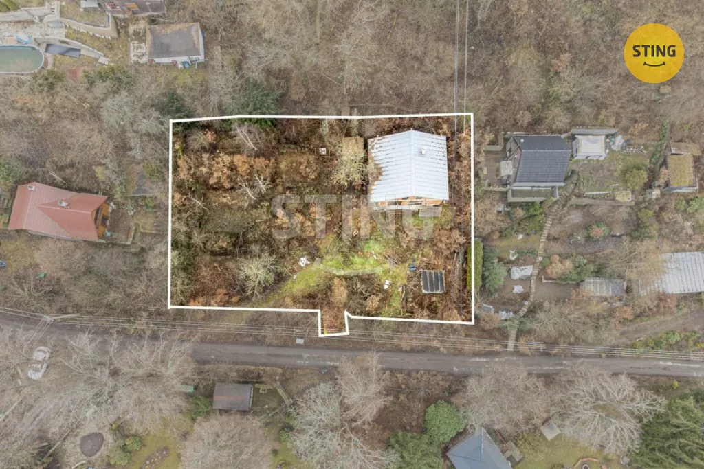 Hlavní pozemek (467 m²) s rozestavěným domem a dvěma dřevníky a druhý pozemek sloužící jako zahrada a příjezdová cesta.