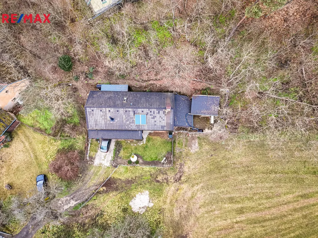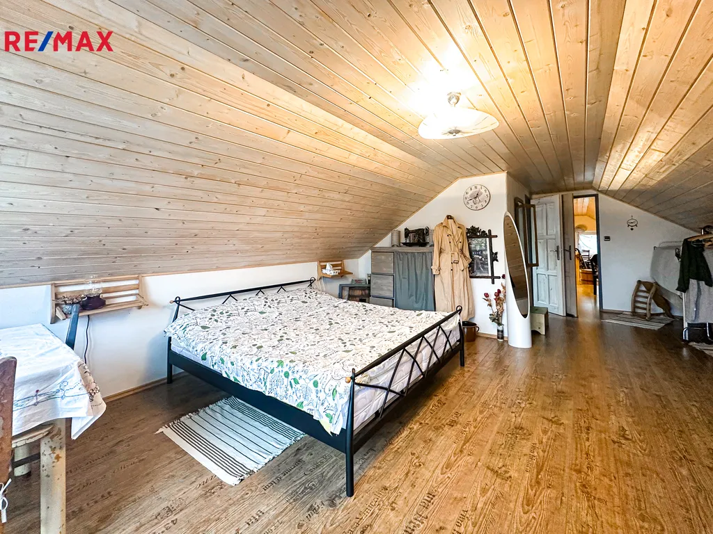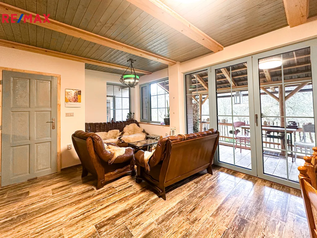 Do domu se vstupuje po několika schodech, kde se přímo dostaneme na velmi prostornou a zastřešenou terasu, kde můžete trávit spoustu času při kávě či odpočinku. Po vstupu do domu se napravo nachází velmi prostorná obytná místnost, které dominuje zcela funkční pec spolu i s kamny (nově postaveno). Prostor této místnosti se otevírá až ke krovu a po schodech se dostanete do prvního patra, kde se nachází další obytný prostor, kteří je otevřený k místnosti s pecí, dále se v patře nachází koupelna s vanou i záchodem, prostorná chodba a ložnice s velkoryse prosklenou stěnou.