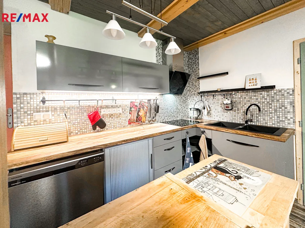 V přízemí se nalevo nachází moderní obytná kuchyně vybavená prémiovými spotřebiči, dále se zde nachází i krbová kamna, které doplňují možnosti vytápění a je zde i přímý vstup na terasu.