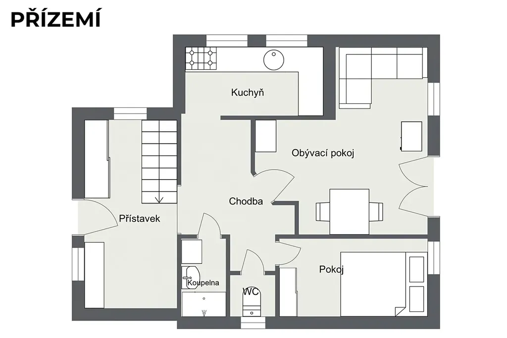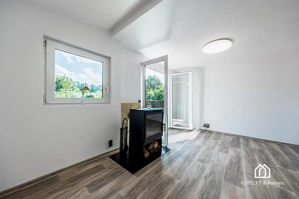 V přízemí se nachází prostorný obývací pokoj s krbovými kamny, které vytvářejí útulnou atmosféru a zároveň zajišťují efektivní vytápění celého domu. Z obývací části se vstupuje přímo na velkou terasu s výhledem do krajiny, ideální pro ranní kávu, večerní posezení i letní grilování. Na terasu navazuje udržovaná zahrada s dostatkem prostoru pro odpočinek i bazén, který je součástí pozemku.