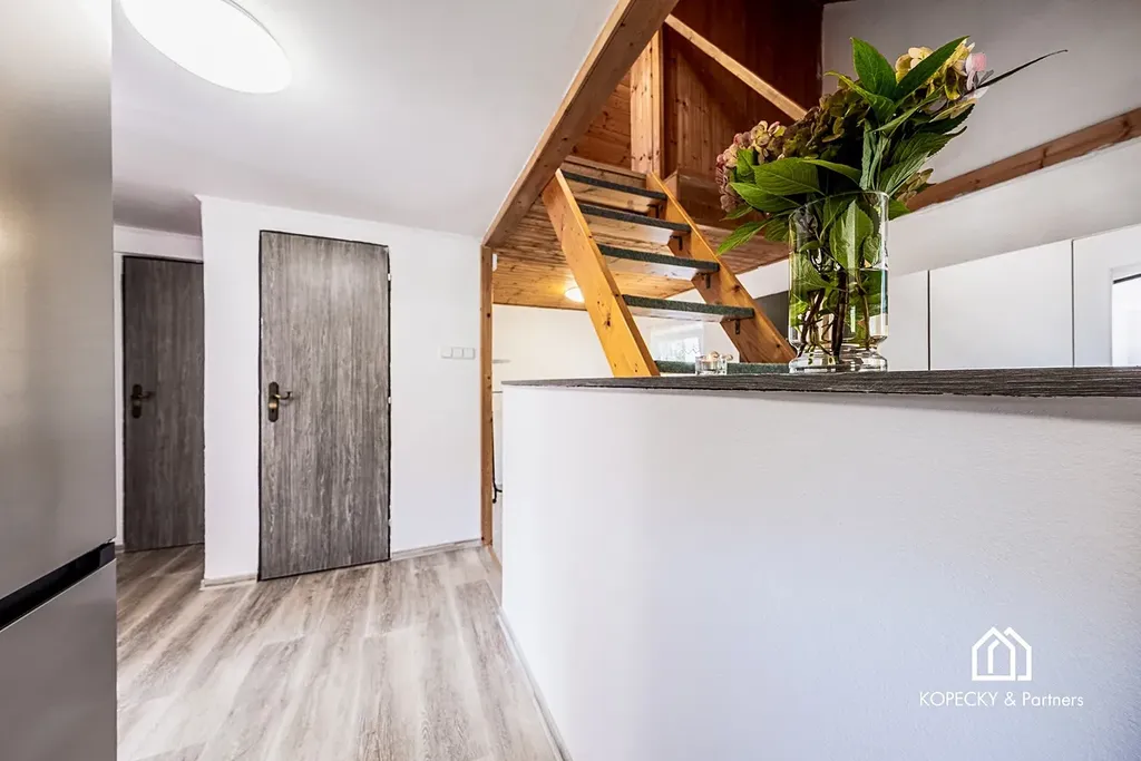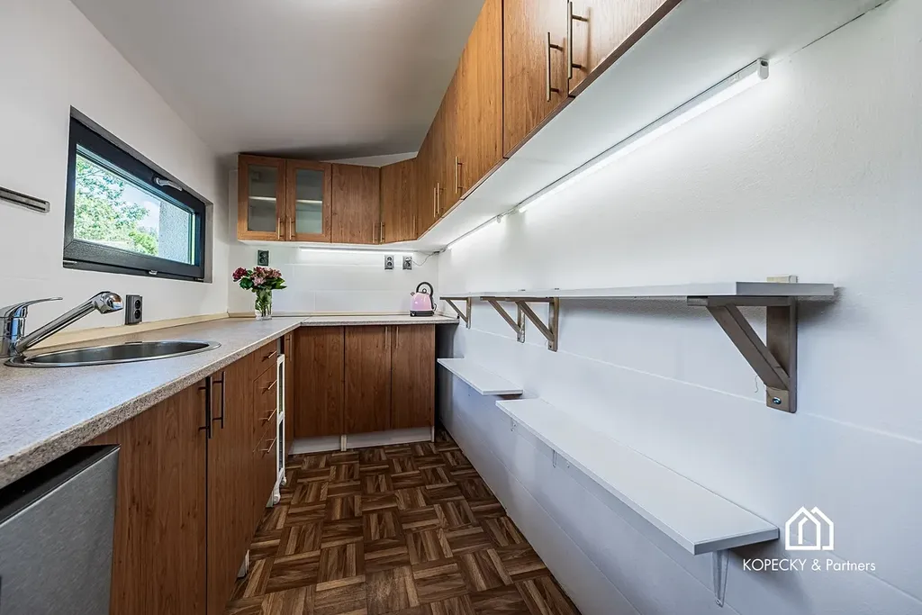 Kuchyň je prakticky propojena s obytným prostorem a působí svěže a funkčně. V podkroví se nachází ložnice s dostatkem úložného prostoru, kterou lze využít i jako pracovnu nebo dětský pokoj. V suterénu je sklep a k dispozici je i kůlna pro uskladnění nářadí. Na pozemku je vybudováno parkovací stání a vjezd na pozemek zajišťuje elektrická brána s dálkovým ovládáním, což podtrhuje komfort i bezpečnost celého objektu.