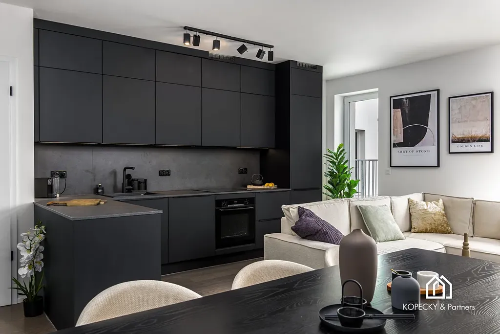 Byt o užitné ploše 115 m² je navržen tak, aby splňoval náročné požadavky na pohodlí i praktičnost. Hlavní obytnou část tvoří světlý obývací pokoj s kuchyňským koutem o rozloze téměř 30 m², který je díky velkým francouzským oknům příjemně prosvětlen a nabízí dostatek prostoru pro rodinné posezení nebo setkání s přáteli. Nechybí zde tři prostorné ložnice a další samostatná místnost, kterou lze využít jako pracovnu, dětský pokoj či pokoj pro hosty.