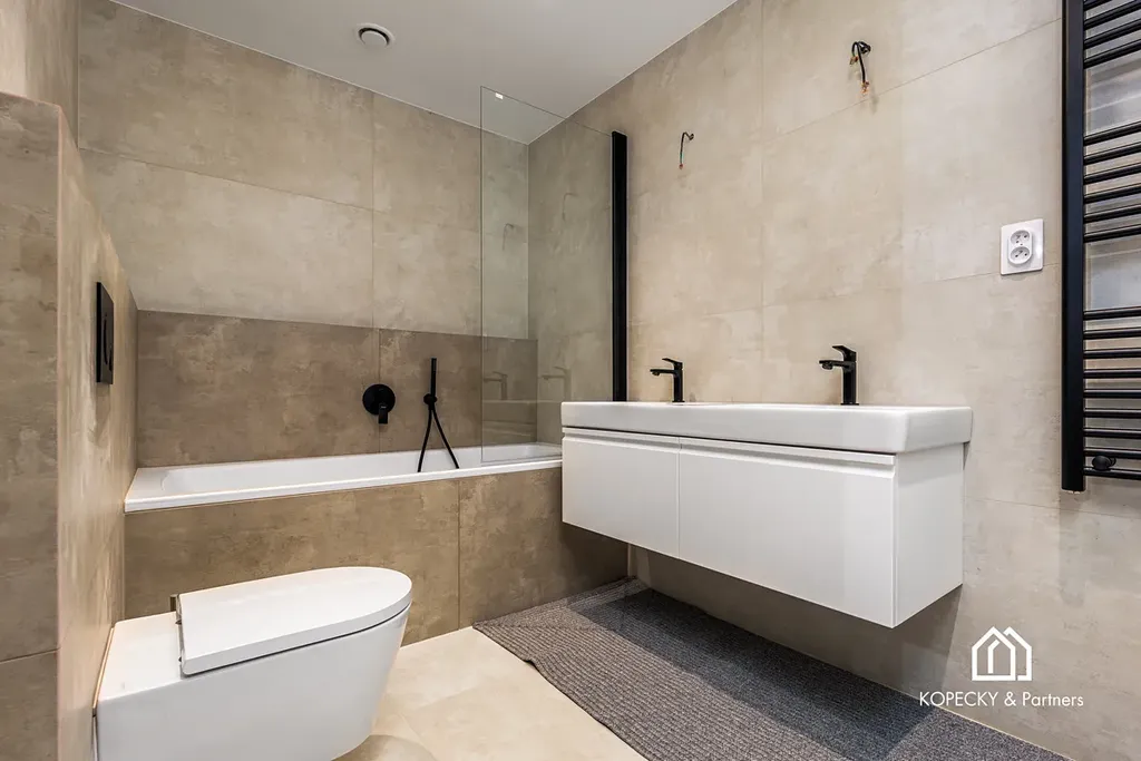 Maximální komfort zajišťují dvě koupelny, z nichž jedna je vybavena vanou a druhá sprchovým koutem. Veškeré obytné prostory pokrývají kvalitní plovoucí podlahy s voděodolnou úpravou, zatímco koupelny a toalety zdobí velkoformátové obklady a dlažba. Samozřejmostí je i vysoce kvalitní sanita, která podtrhuje nadstandardní úroveň vybavení. Pro ukládání všeho potřebného slouží prostorná šatna s dostatečně dimenzovanými úložnými možnostmi.