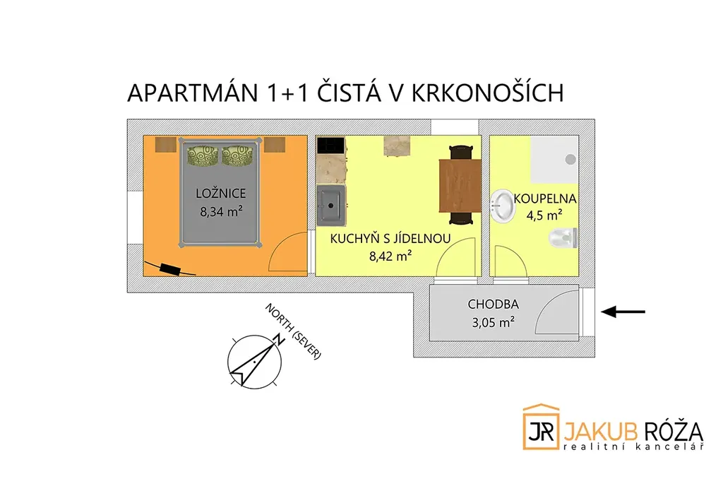 Dispozice je řešena velice prakticky. Ze vstupní chodby lze vejít do koupelny se sprchou a toaletou, dále do kuchyně, ze které se vchází do ložnice. Okno ložnice je orientováno na jihozápad, okno kuchyně severozápadně.