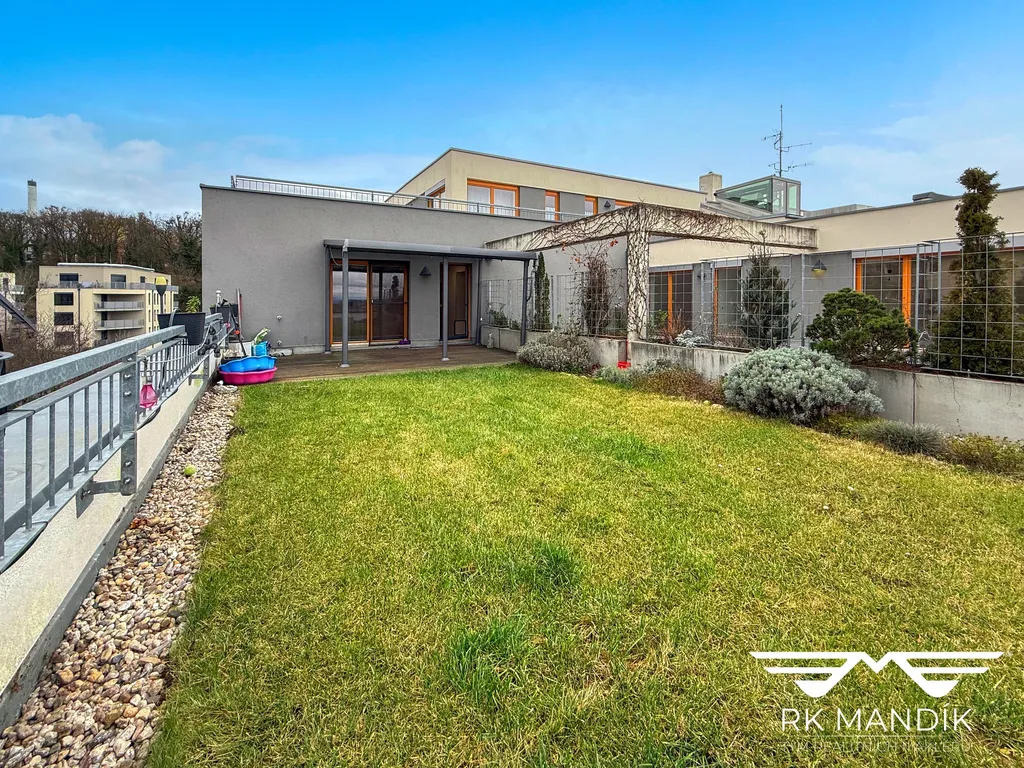 Byt se pronajímá bez vybavení na fotografiích a nachází se ve 3 nadzemním podlaží s dispozicí 3kk o celkové podlahové ploše (77,09 m2) a přímým vstupem na zatravněnou terasu s pergolou o výměře (74,68 m2).