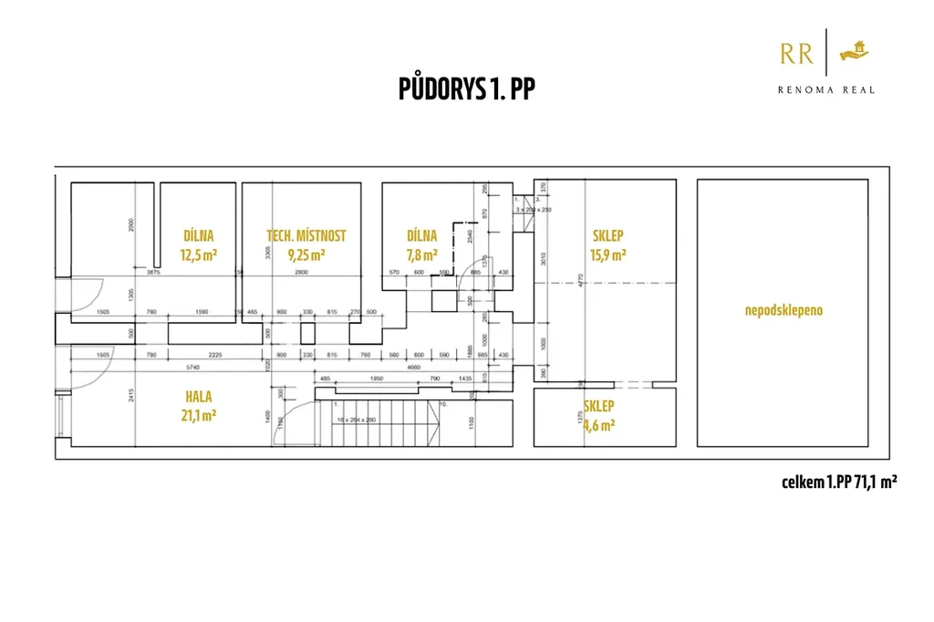 • 1.PP: cca 71 m² – hala, dílna, sklad, sklepy (částečné podsklepení)