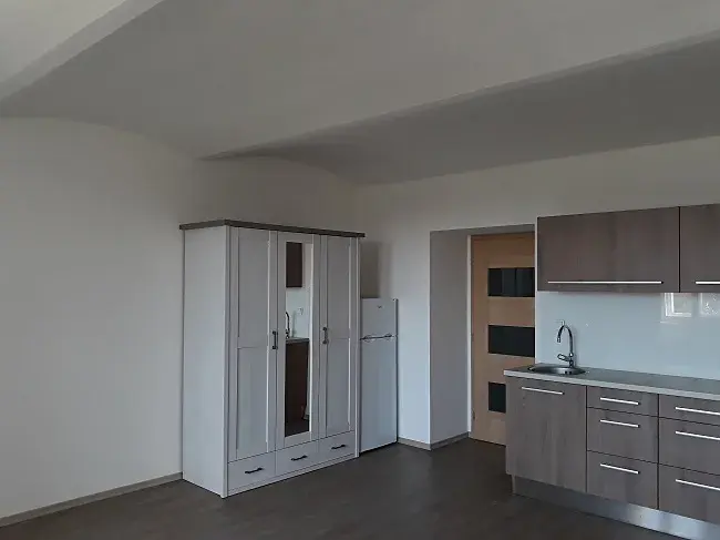 Výměry: pokoj s kuchyňským koutem 28,33 m2, koupelna s vanou a WC 5,22 m2, chodba 7,14 m2. Sklep není k dispozici.