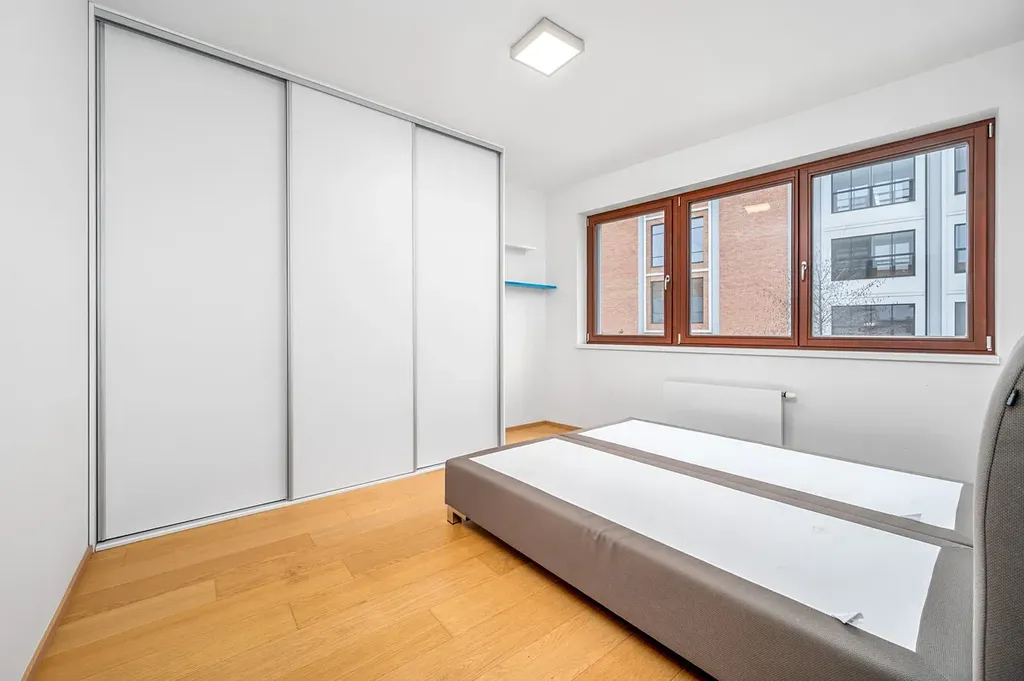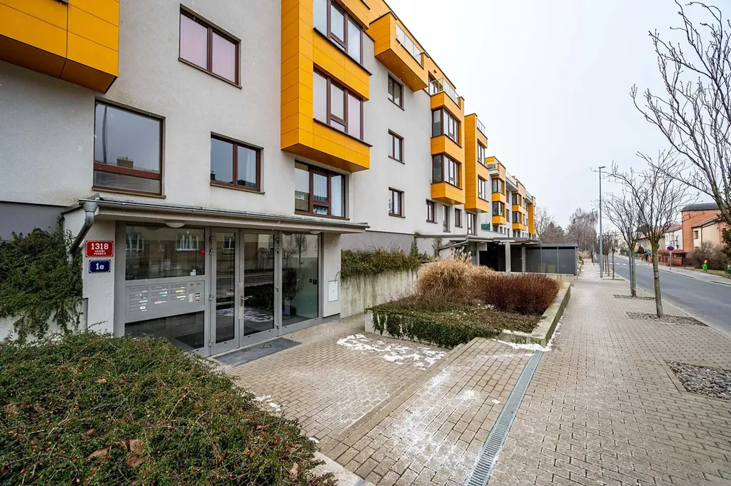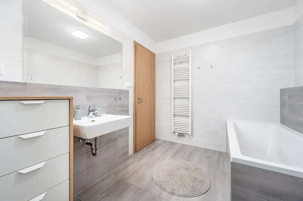 Dispozice je řešená přesně tak, jak má 2+kk fungovat. Obývací pokoj je propojený s plně vybavenou kuchyní, takže prostor působí vzdušně a v každodenním provozu dává smysl. Z obývací části je přímý vstup na balkon orientovaný do vnitrobloku. Ložnice je vybavena postelí a šatní skříní. Koupelna nabízí vanu, umyvadlo a toaletu. Velké plus je samostatná technická místnost s pračkou, sušičkou, bojlerem a plynovým kotlem — díky tomu zůstává koupelna čistá a bez provozního vybavení. Vstupní chodba má vestavěné úložné prostory.