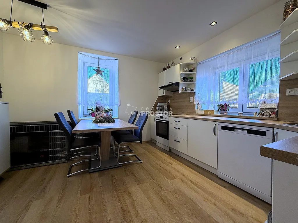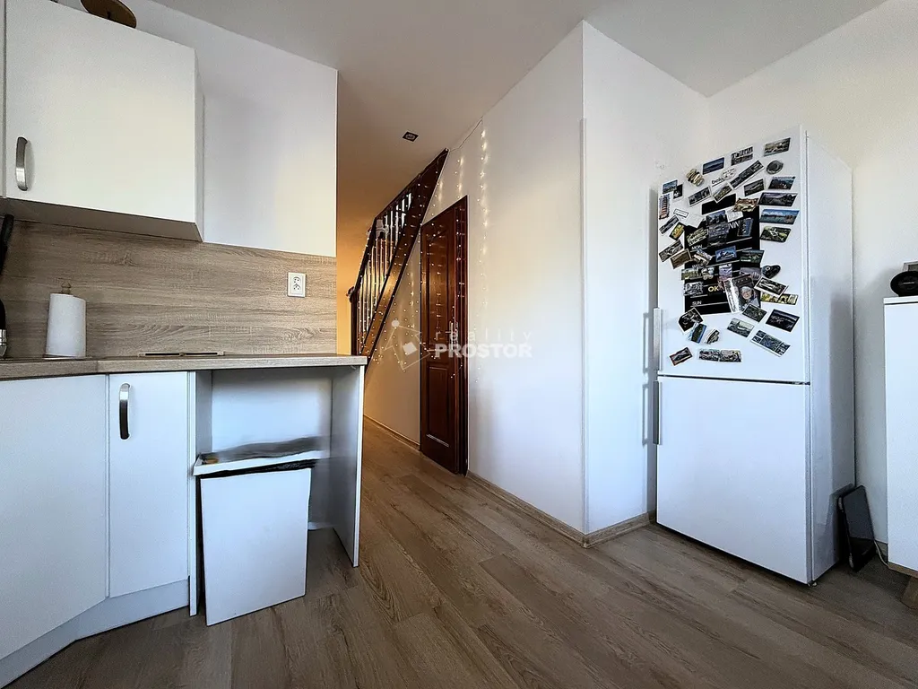 Interiér působí vzdušně a promyšleně. Dominantou je nová prostorná kuchyň vybavená moderní kuchyňskou linkou včetně všech spotřebičů, která nabízí dostatek místa i pro jídelní kout.
