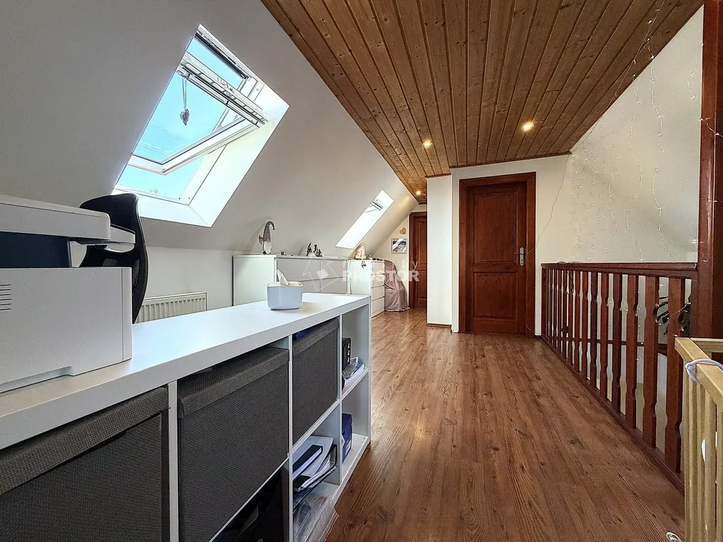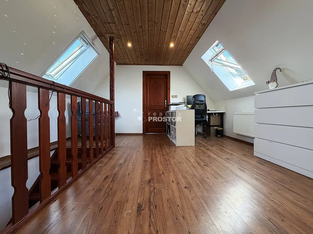 V 2. NP se nachází příjemně světlá ložnice, dětský pokoj, otevřená, velmi prostorná pracovna, velká koupelna je vybavena rohovou vanou, toaletou, dvoj-umyvadlem, prostorem pro pračku a sušičku a místem na sprchový kout.