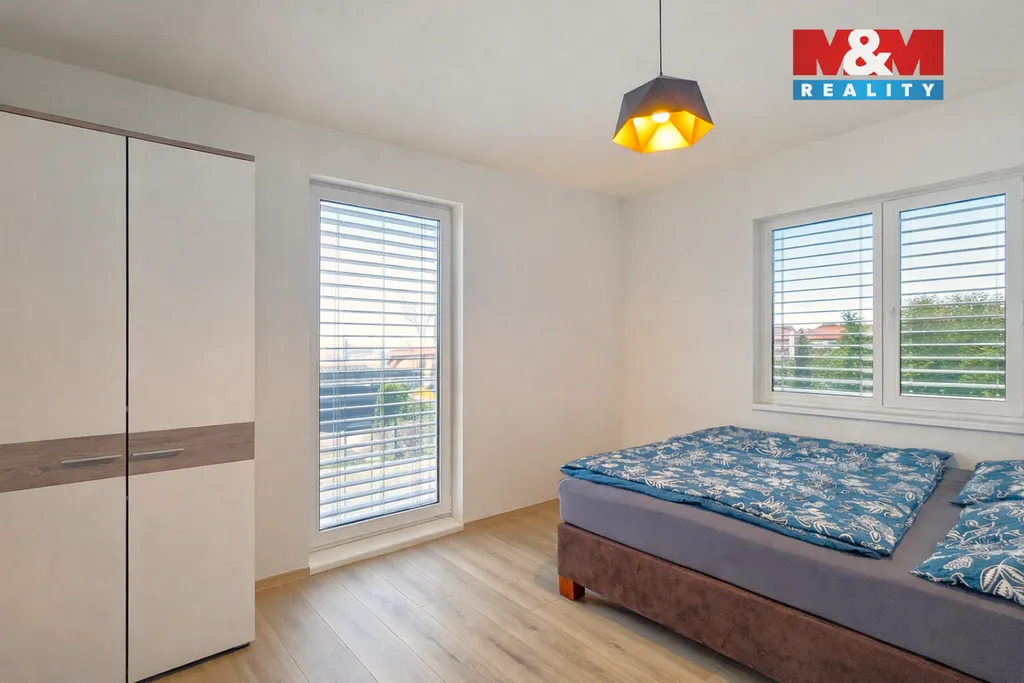 Dispozice 4+kk s užitnou plochou 96 m² zahrnuje tři samostatné ložnice, koupelnu s vanou a toaletou, druhou toaletu v přízemí, prostorný obývací pokoj s krbovými kamny a přímým vstupem na zahradu, technickou místnost a praktický úložný prostor pod schody.