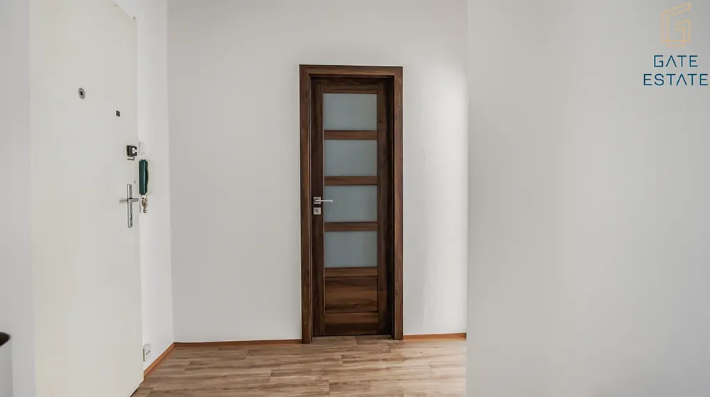 Z velké předsíně bytu se vchází do všech místností. Kuchyň disponuje kuchyňskou linkou s plynovým sporákem, troubou, lednicí a jídelním stolem se židlemi.
