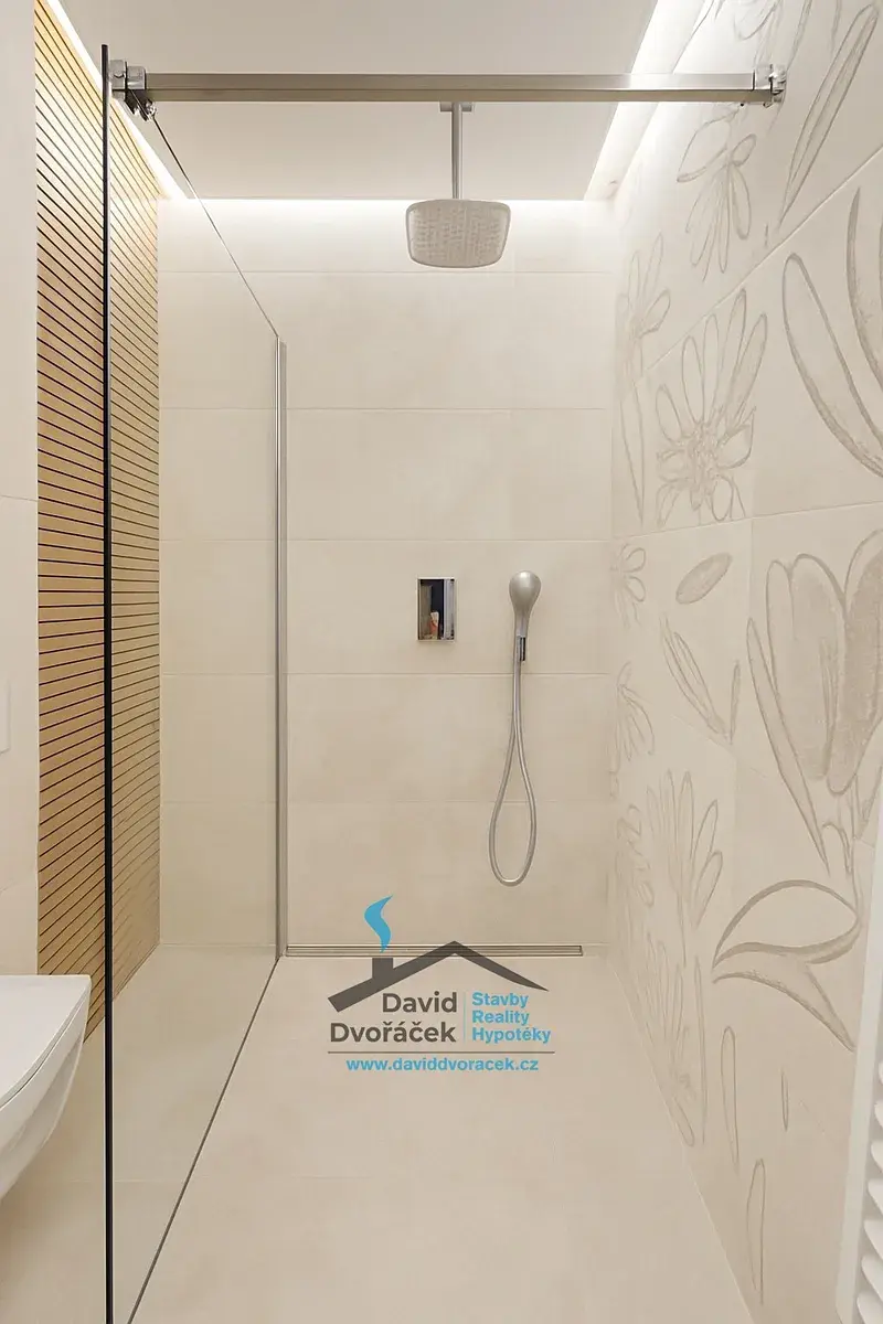 Interiér je řešen nadčasově a elegantně, s použitím prémiových materiálů a kvalitních technologií. Koupelny jsou vybaveny designovou sanitou, rektifikovanými obklady a podomítkovými bateriemi vyšší třídy. Kuchyň je vyrobena na míru a osazena značkovými spotřebiči s prodlouženou zárukou až sedm let. Celek působí klidně, reprezentativně a maximálně komfortně.