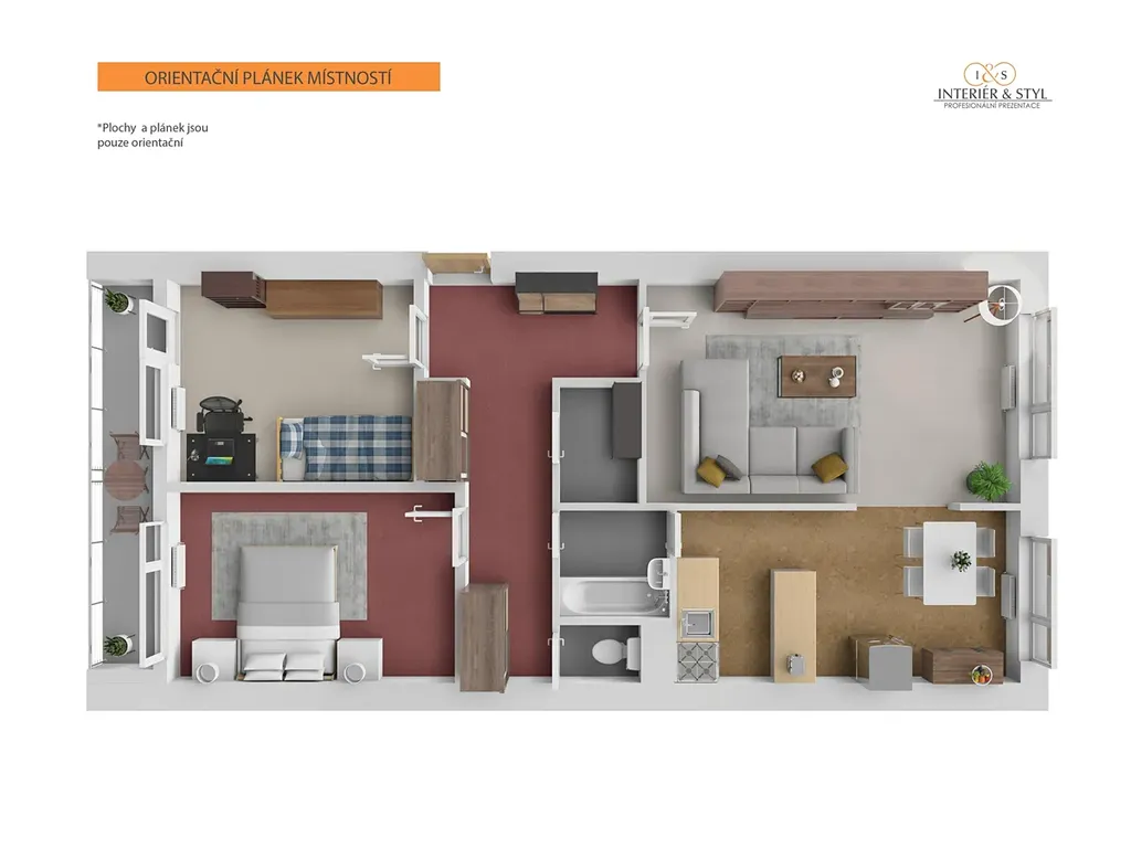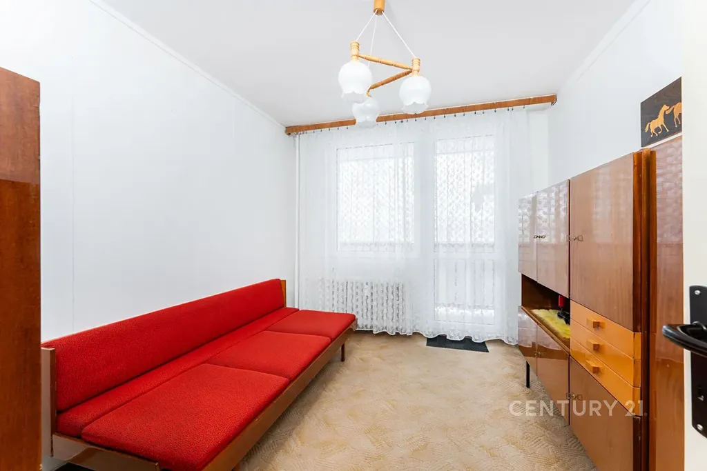 • Dispozice: Obývací pokoj, kuchyně s plynovým sporákem, dvě ložnice, předsíň a původní umakartové jádro (koupelna + samostatné WC).