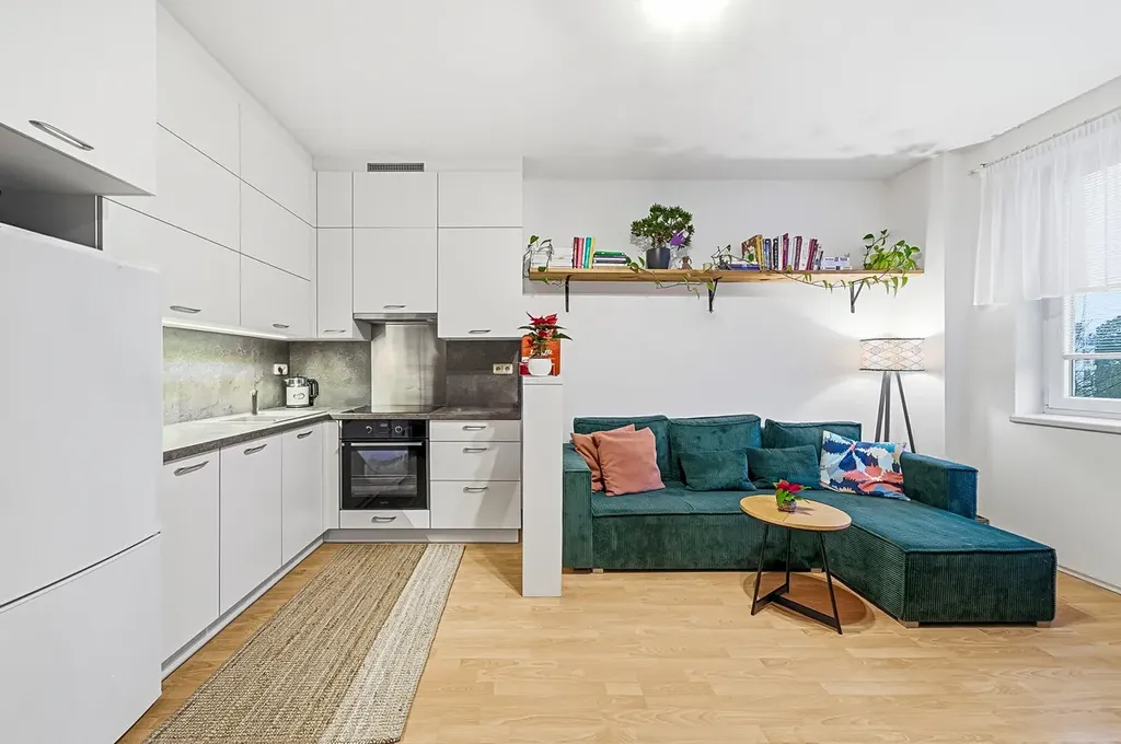 světlý obývací pokoj s kuchyňským koutem