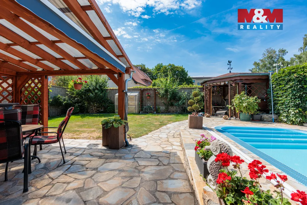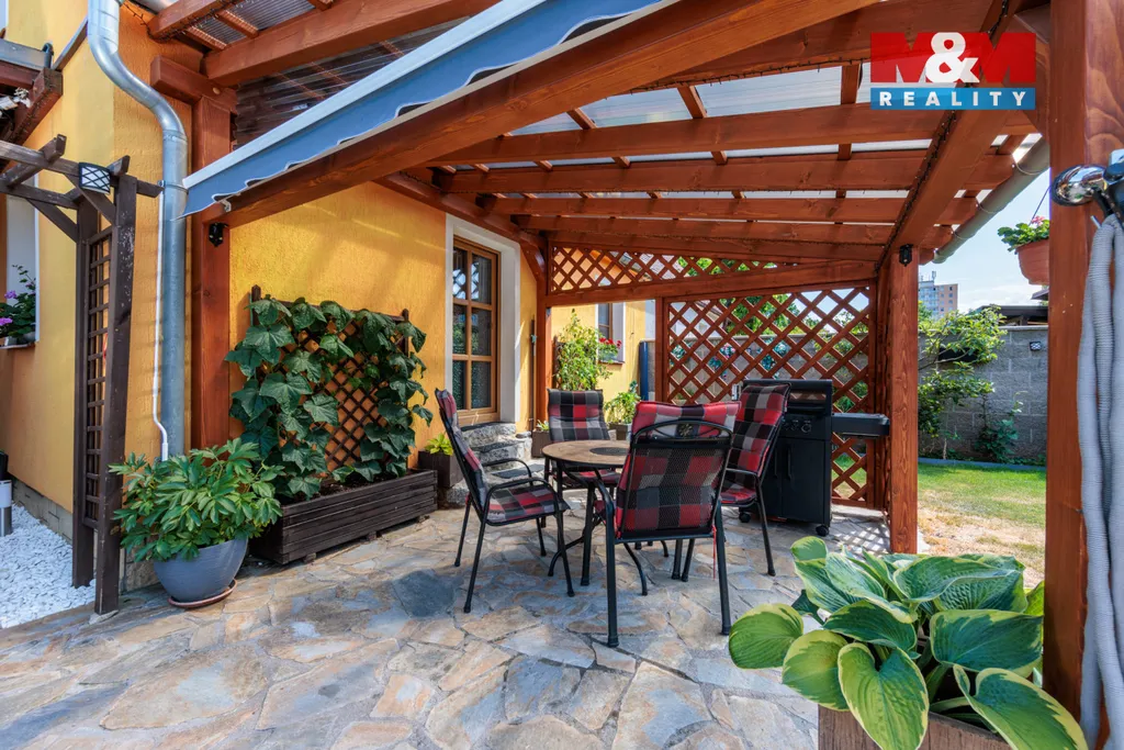 Soukromá zahrada o velikosti 267 m² nabízí krytý, vyhřívaný bazén se slanou vodou, pergolu a grilovací kout. Celý pozemek je oplocen 2,5 m vysokou zdí, doplněn elektrickou bránou a parkováním až pro čtyři vozy.