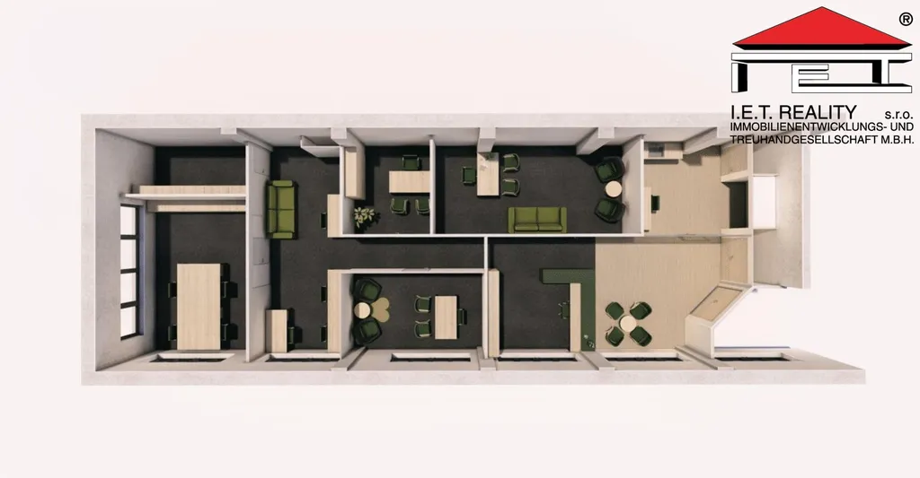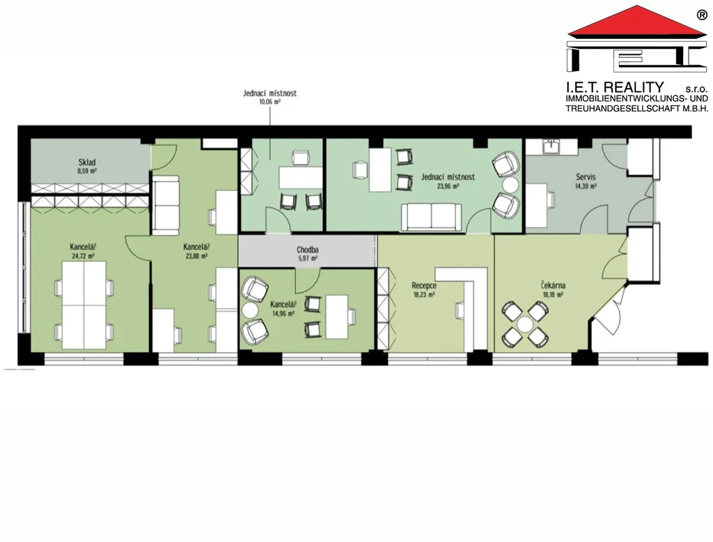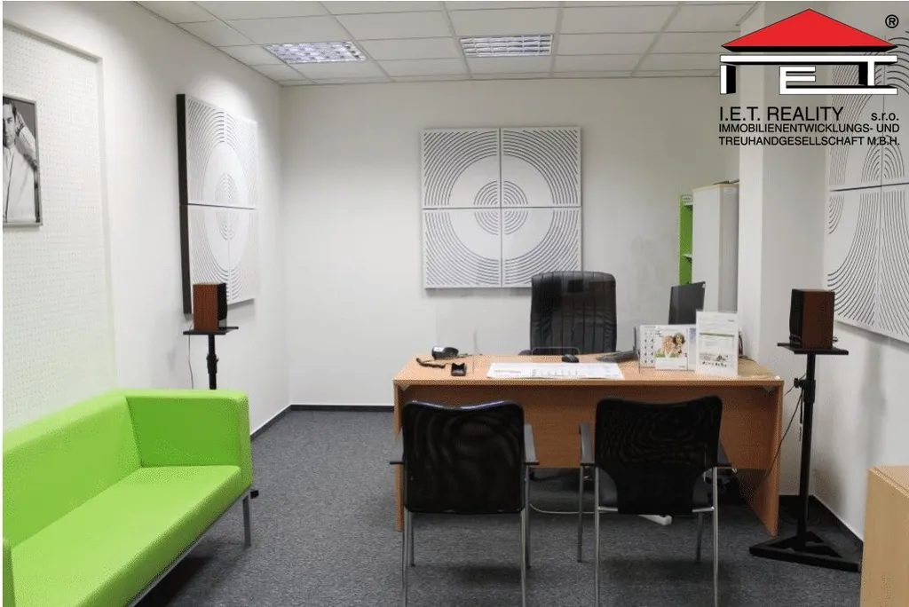 Kancelář se dispozičně skládá z 3 kanceláří o výměře 25 m2, 24 m2 a 15 m2 a 2 uzavřených zasedacích místností o velikosti 10 m2 a 24 m2, dále pak z vlastní recepce (18 m2), čekárny (18 m2) a servisu (14 m2) a skladu (9 m2). Poplatky za užívání kanceláří jsou 125 Kč/m2/měsíc, patří do nich i poplatky za spotřebu elektřiny.