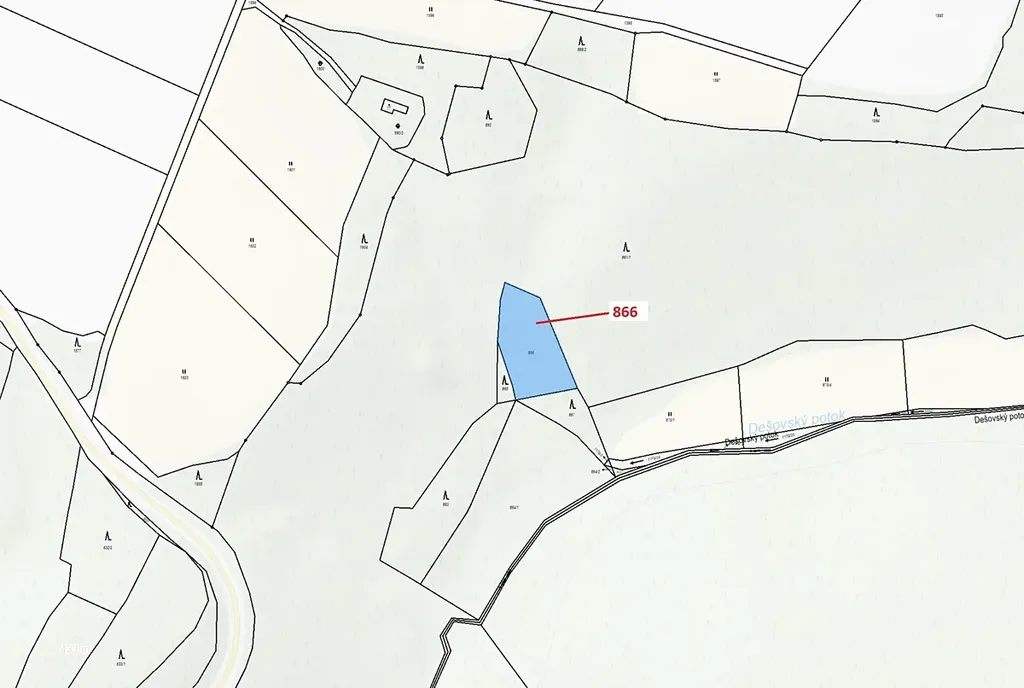 Ostatní plocha o výměře 1277 m2, parcelní číslo 866, podíl 1/1, katastrální území Malý Dešov, obec Dešov, obec s rozšířenou působností Moravské Budějovice, okres Třebíč, Kraj Vysočina.