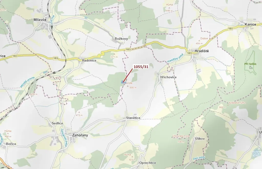 Lesní pozemek o výměře 9 168 m2, parcelní číslo 1055/31, podíl 1/1, katastrální území Radonice u Milavčí, obec Milavče, obec s rozšířenou působností Domažlice, okres Domažlice, Plzeňský kraj.
