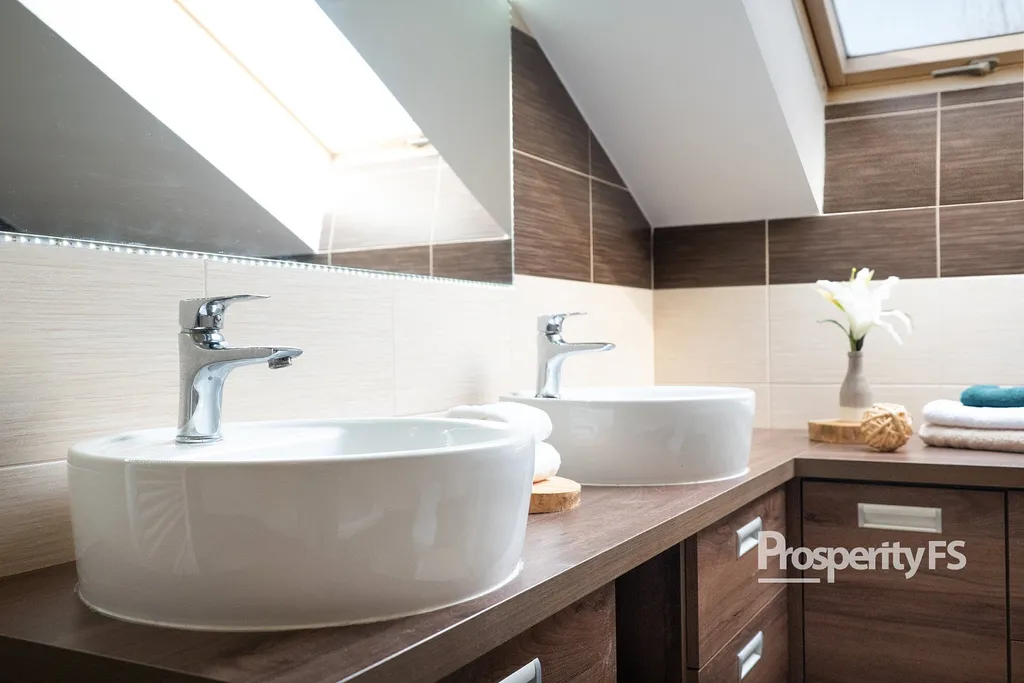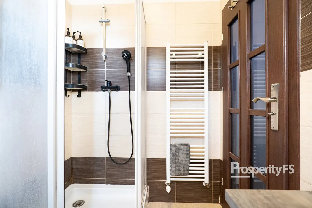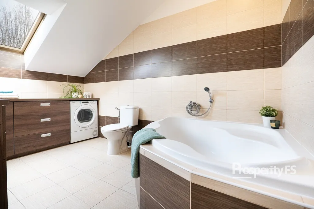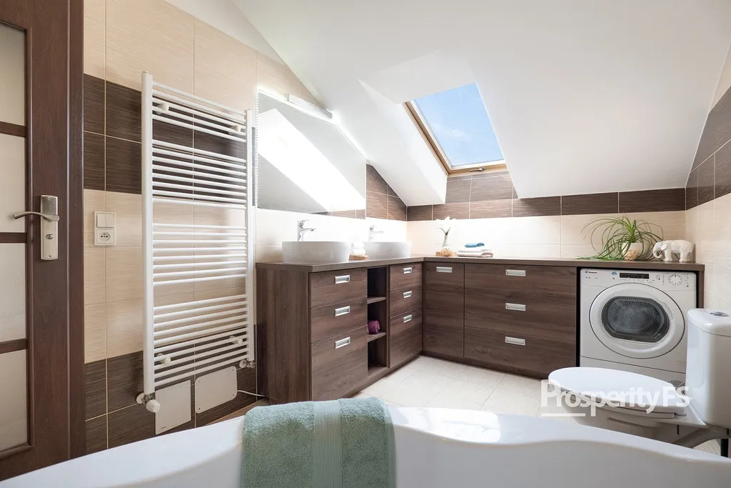 V horním patře se nalezneme 3 neprůchozí místnosti a prostornou koupelnu s podlahovým vytápěním, vanou, WC, 2 umyvadly a praktickým úložným prostorem.