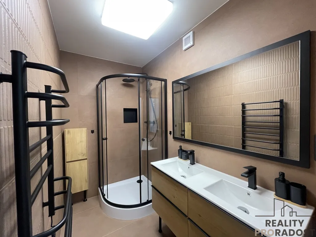koupelna obsahuje nepoužitý sprchový kout, dvě umyvadla, nastavitelný radiátor a úložné prostory