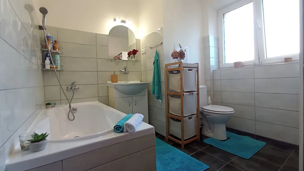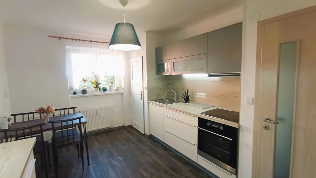 Byt je po rekonstrukci a nabízí se částečně vybavený. Kuchyň je vybavena moderní kuchyňskou linkou s vestavnými spotřebiči - elektrická trouba, sklokeramická varná deska a digestoř. Dále zde nalezneme lednici s mrazákem a jídelní stůl + 4 židle. Součástí kuchyně je prostorný špajz. V obývací pokoji je balkon s výhledem do zahrady za domem. Nábytek vyfocený na fotkách si majitel odveze. Koupelna je vybavena vanou, umyvadlem se skříňkou, otopným žebříkem a je zde umístěno i WC. V předsíni se nachází velká vestavěná skříň. K bytu náleží sklep v přízemí domu a parkovací stání na uzamčeném pozemku, kde je také zahrada s posezením a pískoviště pro děti.