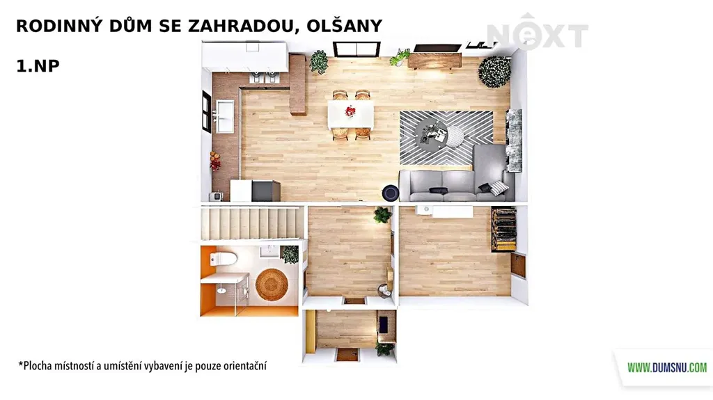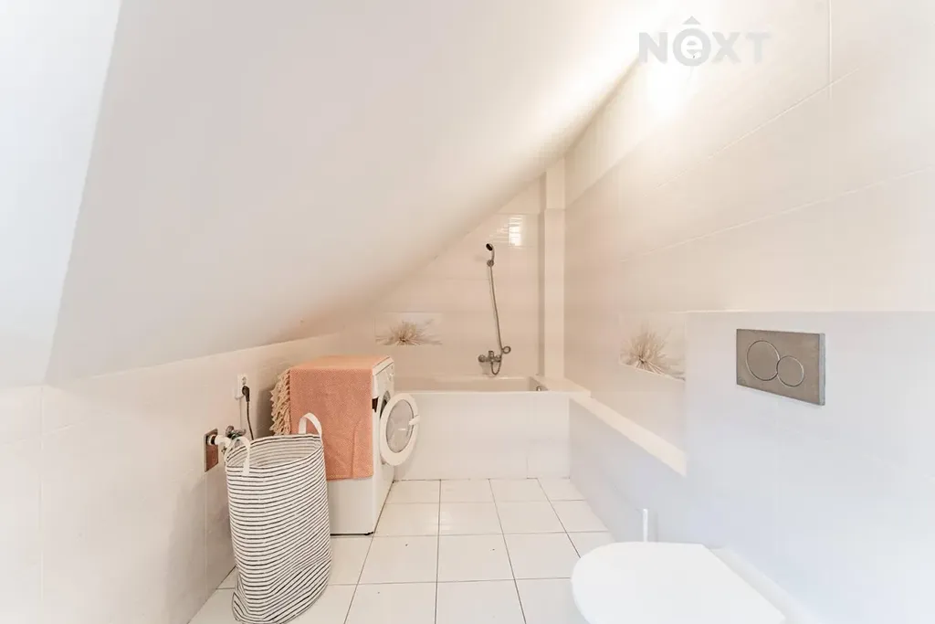 V patře se nachází tři samostatné obytné místnosti, které lze využít jako ložnici, dětské pokoje, pracovnu nebo pokoj pro hosty. Nechybí zde ani druhá koupelna s vanou a toaletou, což výrazně zvyšuje komfort každodenního bydlení.