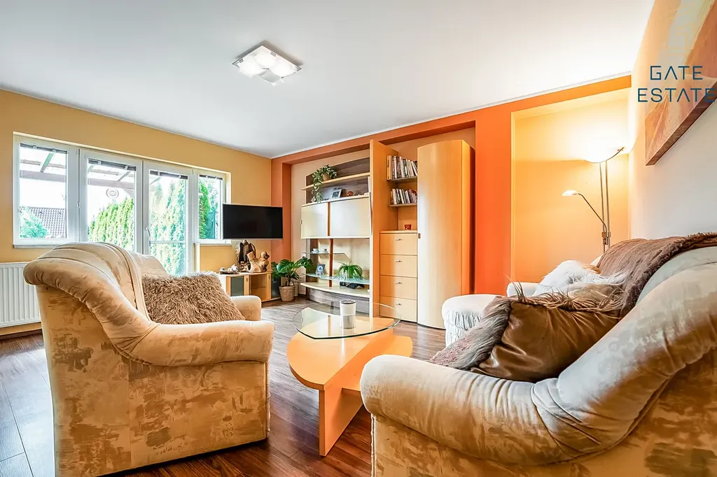 Interiér zaujme promyšleným a praktickým dispozičním řešením. V přízemí se nachází prostorný obývací pokoj s krbem, který je propojený s plně vybavenou kuchyní se zabudovanými spotřebiči a jídelním koutem. Z obytného prostoru je přímý vstup na terasu s pergolou, ideální pro posezení s rodinou nebo přáteli. Přízemí dále nabízí koupelnu a samostatné WC s umyvadlem.
