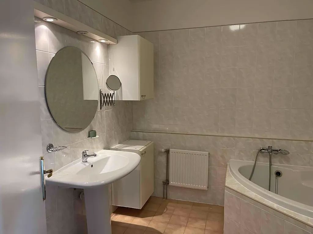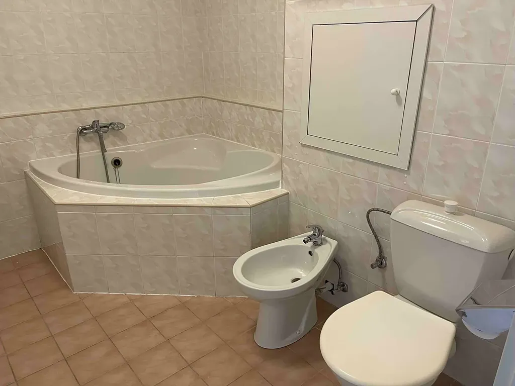 Byt má koupelnu s rohovou vanou a samostatné WC se sprchovým koutem, které se nachází v jedné z ložnic, což zajišťuje vyšší komfort a soukromí.